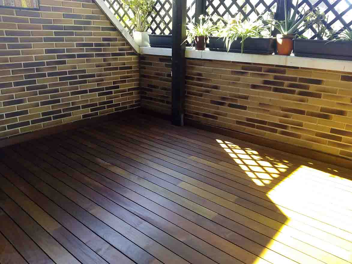 Esto hace que las tarimas exteriores tengan que tener un mantenimiento anual para que se conserven en perfectas condiciones. Las tarimas más habituales son las de las marcas Ipe, Teka, Cumarú, aunque también se colocan con pinos tratados o similares.